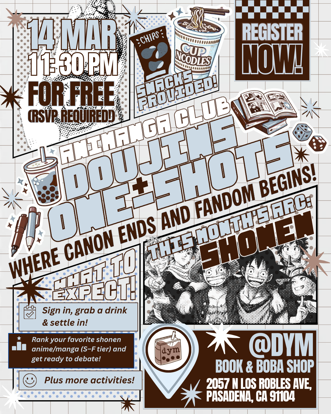 We’re kicking off the very first meeting of the Doujins + One-Shots Animanga Club at DYM Book & Boba Shop—a new once-a-month meetup for anime and manga fans in Pasadena.